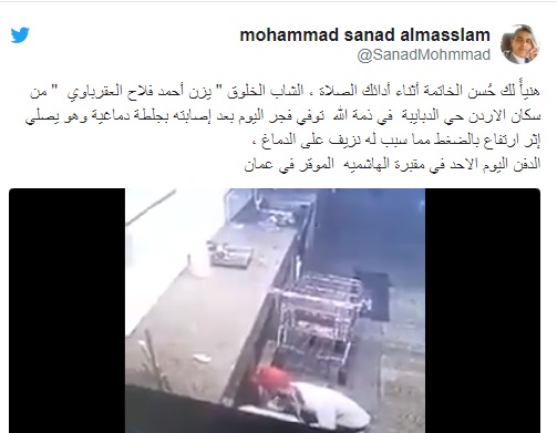 المدينة نيوز:- تداول نشطاء مواقع التواصل الاجتماعي، مقطع فيديو وثّقته كاميرات المراقبة، للحظة وفاة شاب أردني أثناء صلاته في مكان عمله بالأردن.