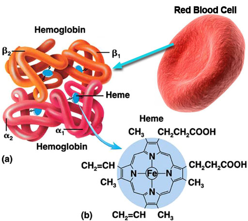 ويلعب الحديد بالغ الأهمية في أجسام الكائنات الحية النباتية منها والحيوانية حيث يدخل في تركيب كثير من البروتينات والأنزيمات التي تقوم بوظائف حيوية مختلفة لا يمكن للكائنات أن تعيش بدونها. ففي الحيوانات يقوم جزيء الهيموجلوبين (hemoglobin) الموجود في كريات الدم الحمراء بنقل الأكسجين من الرئة إلى خلايا الجسم لإتمام عملية الاحتراق فيها ومن ثم نقل ثاني أكسيد الكربون من الخلايا إلى الرئة في طريق العودة. وهذه المهمة المزدوجة للهيموجلوبين من أعجب عجائب تصميم الأشياء ففي النسيج الرئوي الملامس للهواء تكون درجة الحرارة منخفضة والأس الهيدروجيني وتركيز الأوكسجين مرتفعان ولذلك يرتبط الأوكسجين بالهيموجلوبين بشدة. أما في أنسجة الجسم فينعكس الوضع حيث تزداد درجة الحرارة وينخفض الأس الهيدروجيني وتركيز الأوكسجين فيقل الارتباط بينهما ويبدأ الأوكسجين بالانتشار من الدم إلى الأنسجة. وفي حالة ثاني أكسيد الكربون فإن تركيزه في أنسجة الجسم أعلى منه في النسيج الرئوي ولذا فإنه يرتبط بالهيموجلوبين بعد إفراغ حمولته من الأوكسجين ويحمله الدم إلى الرئتين حيث تتم عملية التبادل بين الأوكسجين وثاني أكسيد الكربون. ويتم تصنيع كريات الدم الحمراء في نخاع العظام ويبلغ متوسط عمرها 120 يوما ويتم تدمير الهرمة منها في الطحال والكبد من قبل بعض الخلايا الملتهمة التي تقوم باستخلاص الحديد الموجود في الهيموجلوبين من الخلايا الميتة وإعادته إلى الجسم ليعاد استخدامه في خلايا جديدة. أما في النباتات فيدخل الحديد في تركيب كثير من الأنزيمات من أهمها تلك التي تساعد في تصنيع جزيء الكلوروفيل وعمليات التركيب الضوئي.
