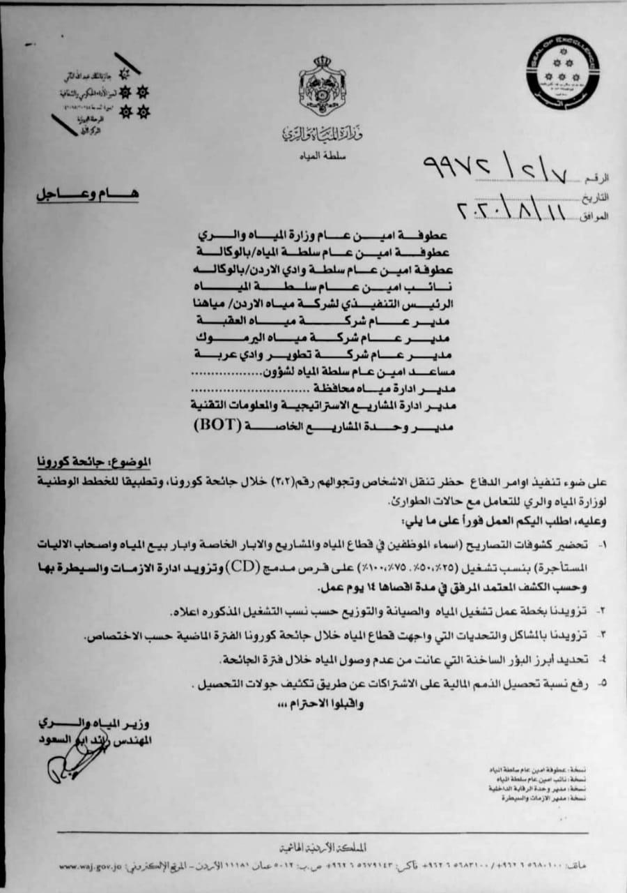 تعميم من وزير المياه لاصدار تصاريح للعاملين في قطاعاتها
