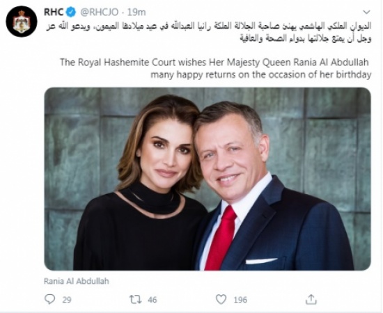 المدينة نيوز:- هنأ الديوان الملكي الهاشمي الملكة رانيا العبدالله في عيد ميلادها الذي يصادف اليوم الاثنين.