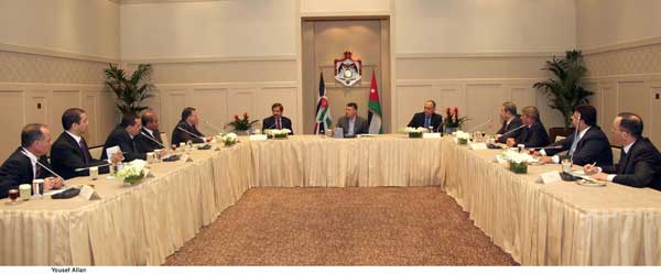 من جانب آخر، ترأس جلالة الملك مساء اليوم لقاءً، حضره رئيس الوزراء الدكتور معروف البخيت، ورئيس الديوان الملكي الهاشمي الدكتور خالد الكركي، ومستشار جلالة الملك لشؤون الإعلام والاتصال أمجد العضايلة، ووزير الصناعة والتجارة الدكتور هاني الملقي، ووزير التخطيط والتعاون الدولي الدكتور جعفر حسان، ووزير الدولة لشؤون الإعلام والاتصال طاهر العدوان، وعدد من المسؤولين، تم خلاله استعراض التحديات التي تواجه الاقتصاد الأردني، وسبل اتخاذ ما يلزم من إجراءات لتشجيع رجال الأعمال والمستثمرين على القدوم إلى المملكة، وطمأنتهم على المناخ الاستثماري في الأردن، والميزات والفرص التي يوفرها الاقتصاد الوطني.