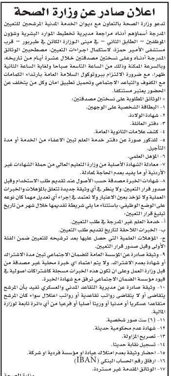 المدينة نيوز:- دعت وزارة الصحة، الاحد، المرشحين للتعيين المدرجة أسماؤهم مراجعة مديرية تخطيط الموارد البشرية وشؤون الموظفين في مبنى الوزارة.