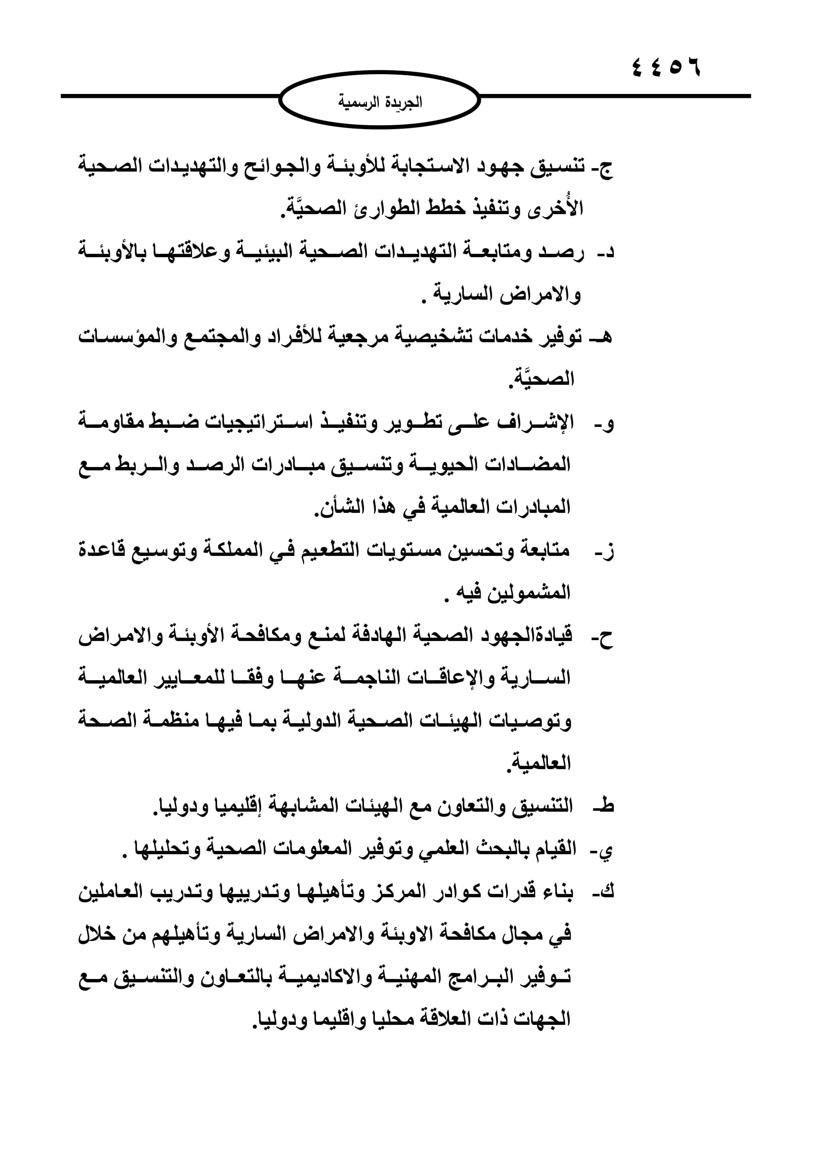 وبموجب النظام، يتولى المركز صلاحيات إعداد السياسات الصحية المتعلقة بمكافحة الأوبئة والأمراض السارية والتوصية بها للجهات المختصة، ورصد الأوبئة والأمراض السارية وطنياَ وإقليميا ودولياً، والكشف عن التهديدات الجديدة أو الناشئة والتوصية بشأن الوقاية منها، وتنسيق جهود الاستجابة للأوبئة والجوائح والتهديدات الصحية الأخرى وتنفيذ خطط الطوارئ الصحية.