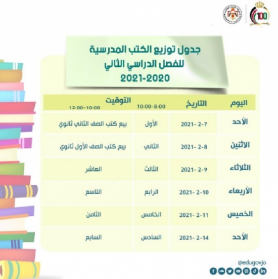 المدينة نيوز :- نشرت وزارة التربية والتعليم الأربعاء، جدول توزيع الكتب المدرسية للفصل الدراسي الثاني 2020-2021.