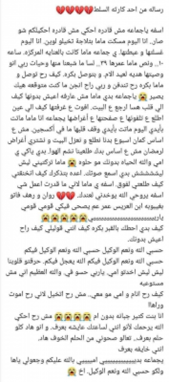 المدينة نيوز :- تداول رواد مواقع التواصل الاجتماعي رسالة فتاة فقدت والدتها بحادثة السلط الاليمة التي وقعت اليوم .