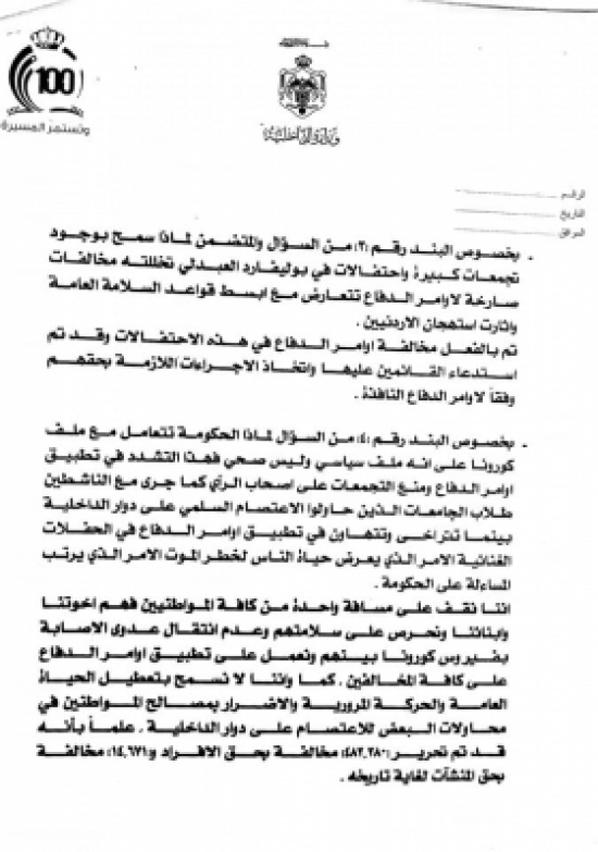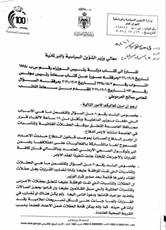 المدينة نيوز :- نشر النائب المحامي صالح العرموطي ، جواب وزير الداخلية مازن الفراية لسؤاله عن أوامر الدفاع وإقامة الحفلات وفتح الملاهي الليلية